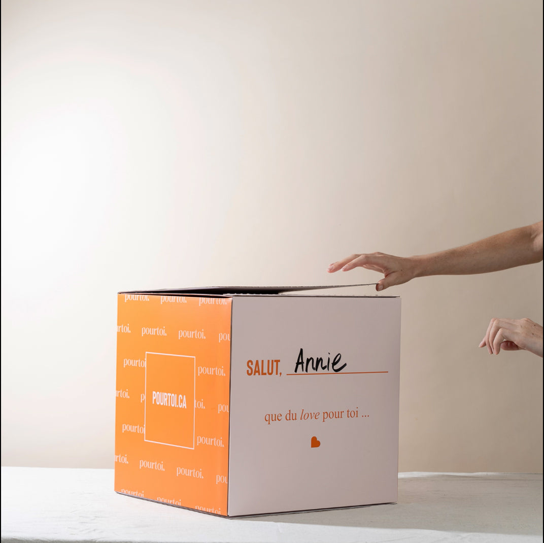 Inquiète-toi pas, on ajoute une étiquette cadeau sur chaque boîte avec le nom de la personne qui offre et le nom de celle qui reçoit. Nous avons quand même pensé à tout! ;)