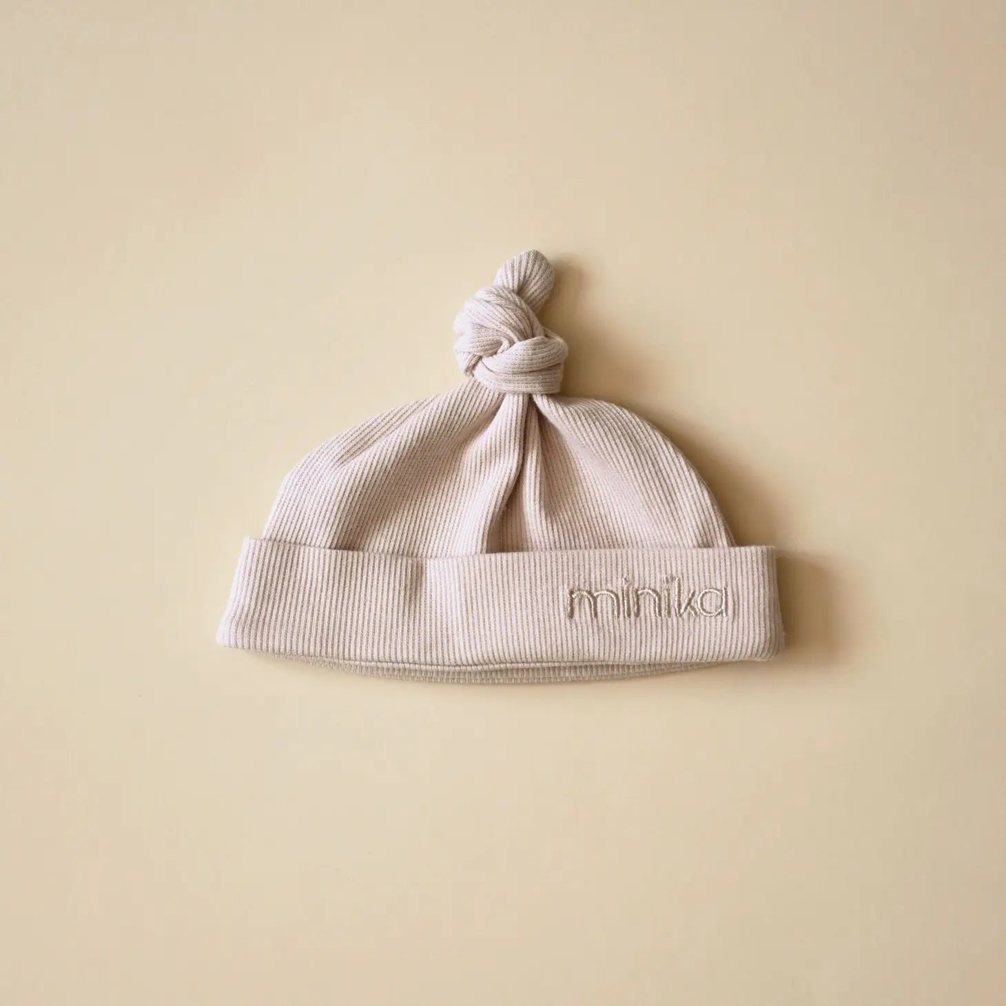 Bonnet côtelé pour bébé. 0-3 mois. 19 cm de longueur, 17 cm de largeur. 95 % coton biologique, 5 % élasthanne.