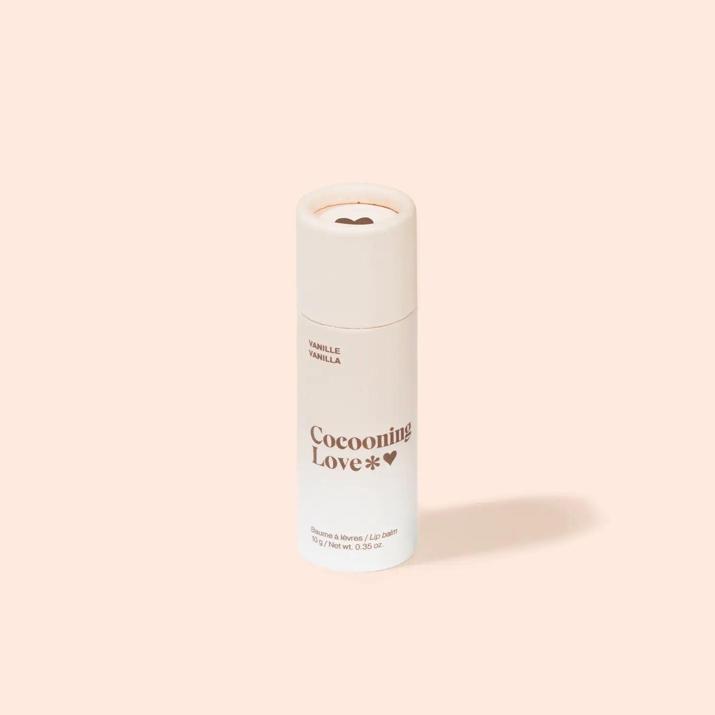 Lip balm Coocooning love - vanille Baume à lèvres naturel et végétalien pour les lèvres à croquer, au goût de vanille gourmande. Emballage carton 100% sans plastique. La formule non collante hydrate et adoucit les lèvres sèches. Fabriqué au Québec.