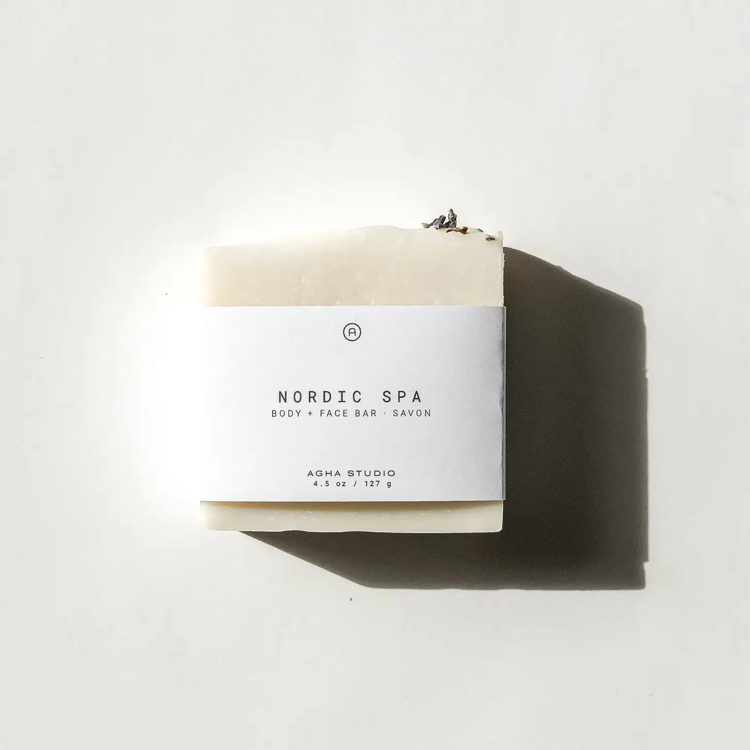 BARRE DE VISAGE CORPS DE SPA NORDIQUE. Cette barre pour le visage Nordic Spa Body, 100% naturelle est formulée pour nettoyer et adoucir la peau en douceur avec du beurre et des huiles végétaliennes, de l'argile kaolin et des huiles essentielles relaxantes. Nos pains de savon sont sans paume, végétaliens et emballés de manière durable. Nos produits sont fabriqués à la main dans notre atelier en petits lots. Fabriqué au Canada.